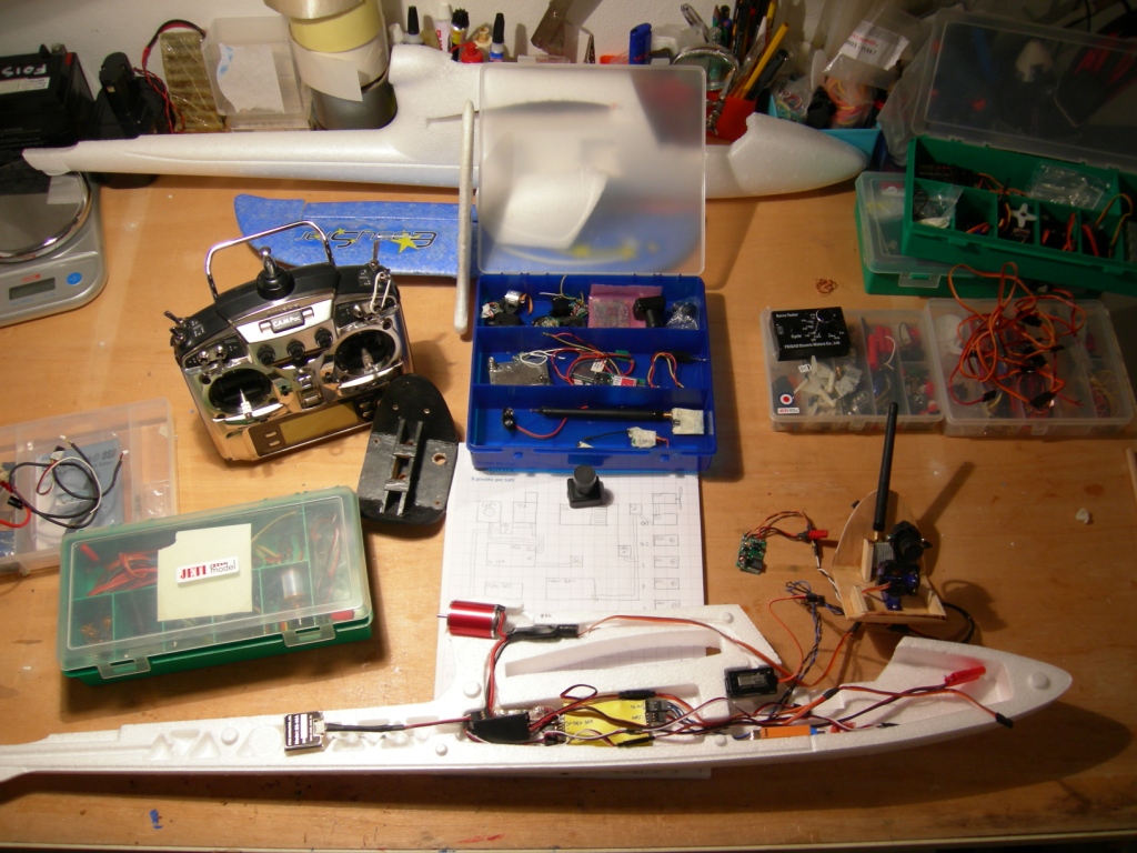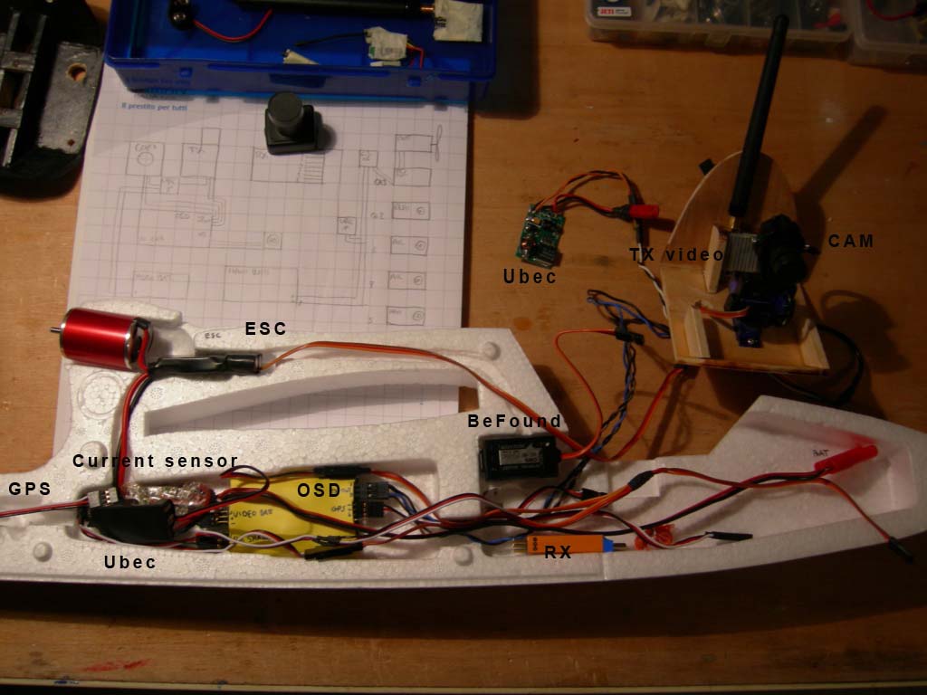 5) Spartire l'energia è veramente un problema; due UBEC saranno eccessivi ma rappresenta, ad oggi, l'unica soluzione al rumore rf e all' "enorme" quantità di energia richiesta (N°5 servi+RX+TXvideo+Cam)