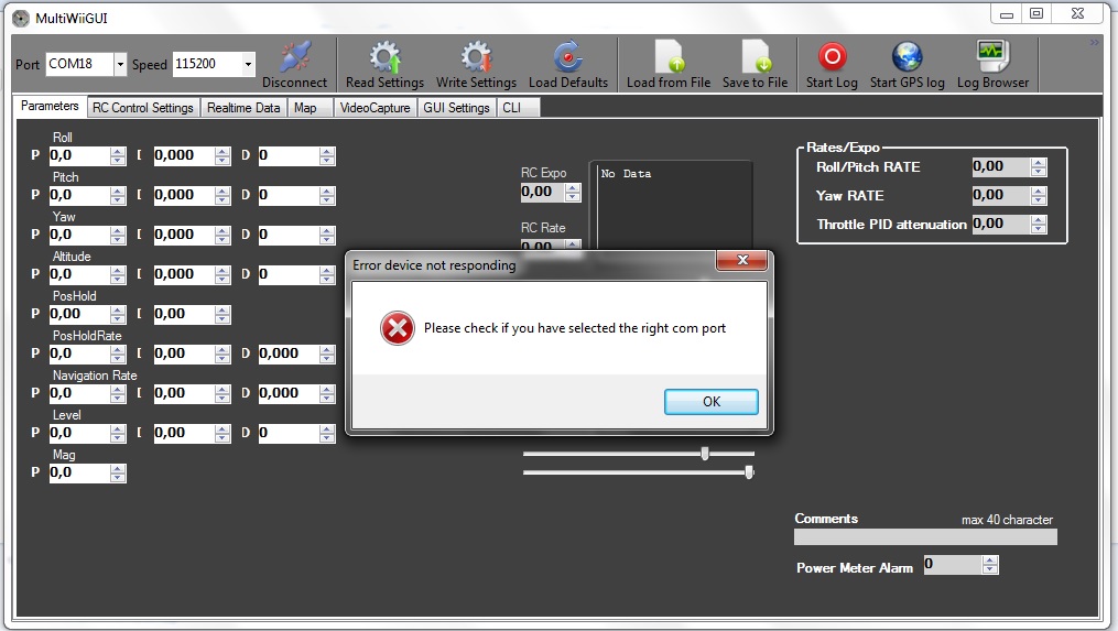 se vado in multiwii conf mi dice di controllare se la porta selezionata è giusta.